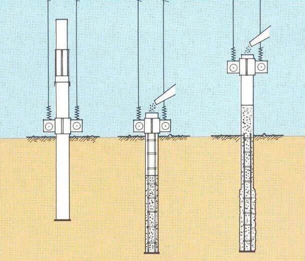- Bij het bereiken van het gewenste paalpuntniveau, wordt de wapening in de buis afgehangen, nadat is gecontroleerd of de buis droog en vrij van grond is;